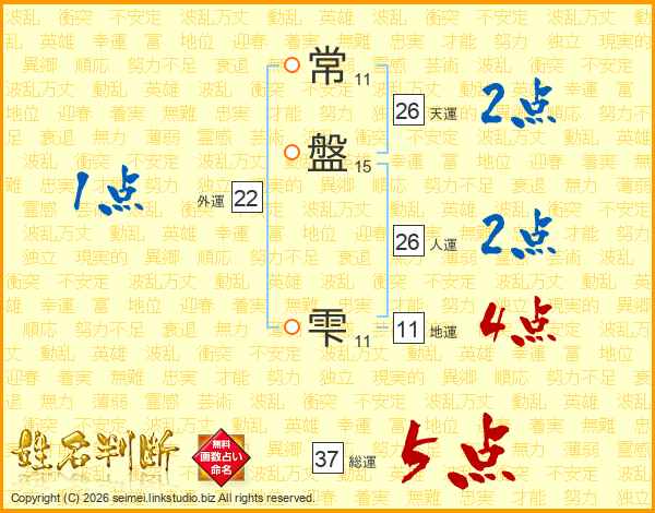 生活面を象徴する運勢です。外部から受ける影響力を表し、結婚運、家庭運や職場、環境への順応性を表します。総運から人運を引いた画数。姓や名が1文字の場合を除く。