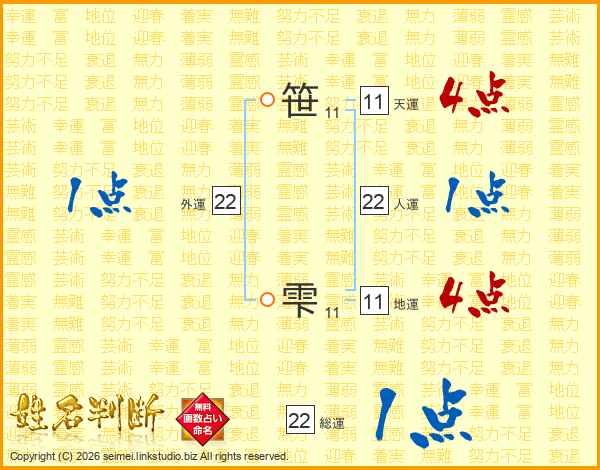 あなたの人生を表す1番重要な運勢です。生涯を通じて影響する総合運となり、主に50歳以降の晩年期に影響を及ぼします。苗字と名前の合計画数。