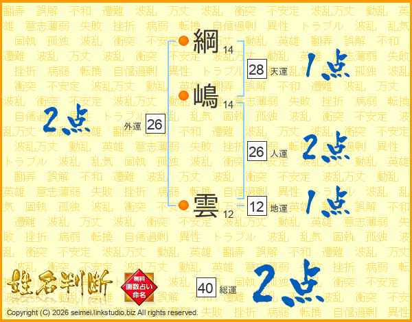 あなたの人生を表す1番重要な運勢です。生涯を通じて影響する総合運となり、主に50歳以降の晩年期に影響を及ぼします。苗字と名前の合計画数。