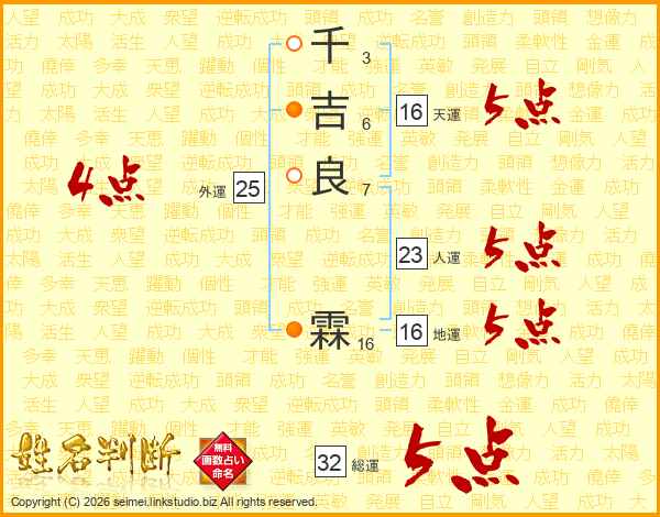 千吉良霖さんの総運は32画の5点!