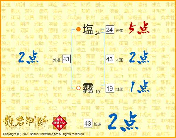 生活面を象徴する運勢です。外部から受ける影響力を表し、結婚運、家庭運や職場、環境への順応性を表します。総運から人運を引いた画数。姓や名が1文字の場合を除く。