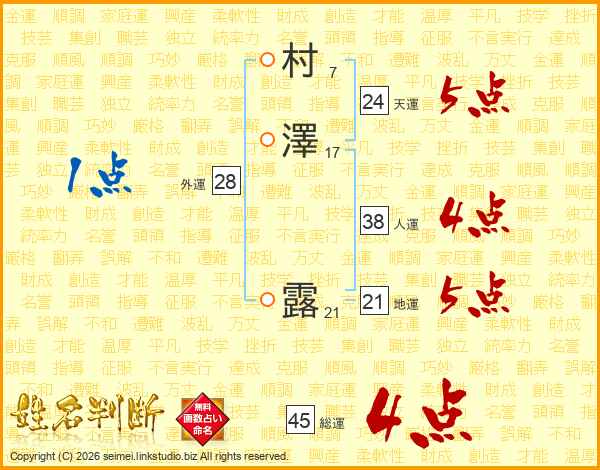 生活面を象徴する運勢です。外部から受ける影響力を表し、結婚運、家庭運や職場、環境への順応性を表します。総運から人運を引いた画数。姓や名が1文字の場合を除く。