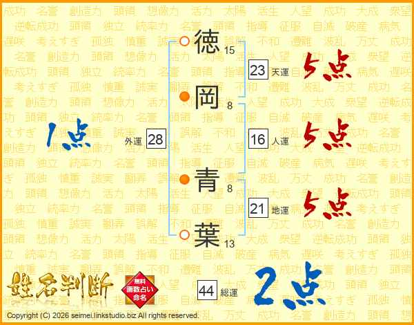 徳(15画)岡(8画) 青(8画)葉(13画)