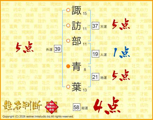 諏(15画)訪(11画)部(11画) 青(8画)葉(13画)