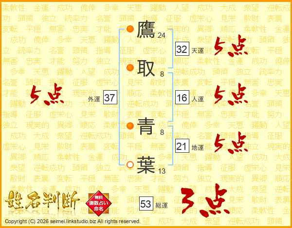 鷹(24画)取(8画) 青(8画)葉(13画)