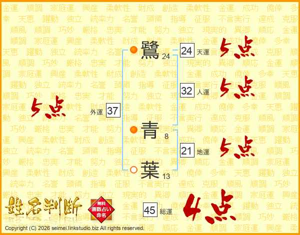鷺青葉さんの総運は45画の4点!