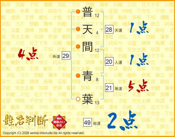 普(12画)天(4画)間(12画) 青(8画)葉(13画)