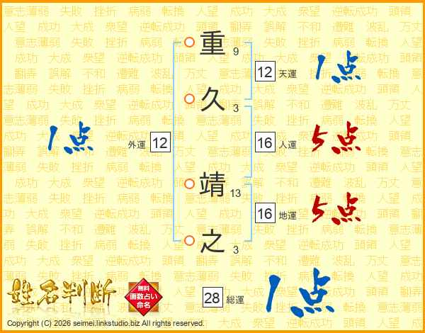 生活面を象徴する運勢です。外部から受ける影響力を表し、結婚運、家庭運や職場、環境への順応性を表します。総運から人運を引いた画数。姓や名が1文字の場合を除く。