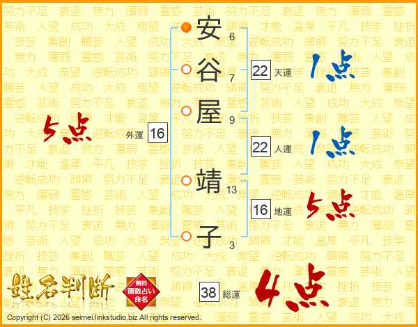 安谷屋靖子さんの総運は38画の4点!