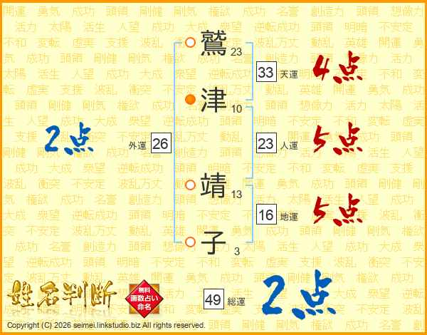 鷲(23画)津(10画) 靖(13画)子(3画)