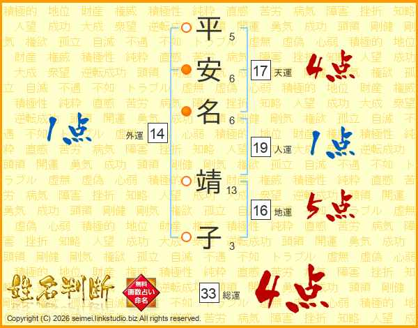 平安名靖子さんの総運は33画の4点!