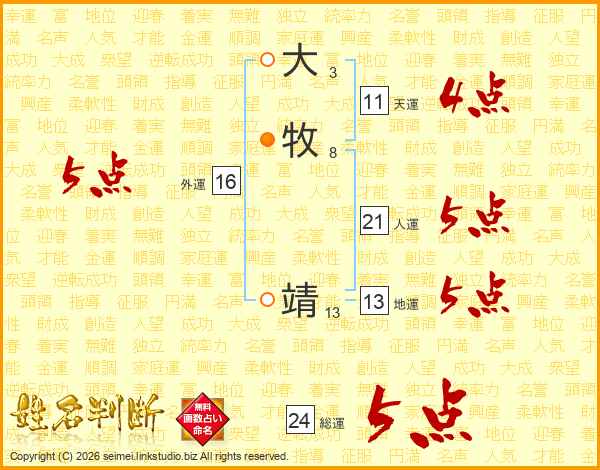 あなたの人生を表す1番重要な運勢です。生涯を通じて影響する総合運となり、主に50歳以降の晩年期に影響を及ぼします。苗字と名前の合計画数。