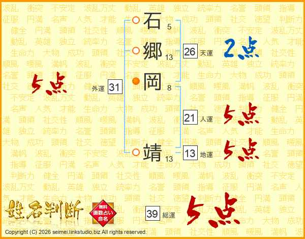 石(5画)郷(13画)岡(8画) 靖(13画)