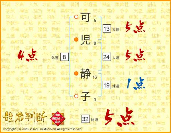 生活面を象徴する運勢です。外部から受ける影響力を表し、結婚運、家庭運や職場、環境への順応性を表します。総運から人運を引いた画数。姓や名が1文字の場合を除く。