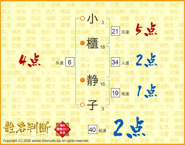 生活面を象徴する運勢です。外部から受ける影響力を表し、結婚運、家庭運や職場、環境への順応性を表します。総運から人運を引いた画数。姓や名が1文字の場合を除く。