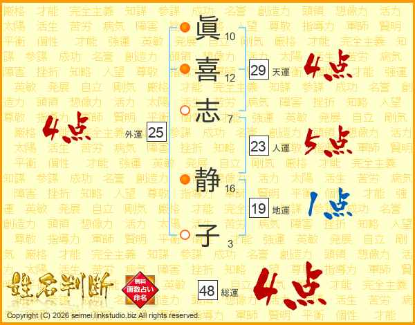 眞(10画)喜(12画)志(7画) 静(16画)子(3画)