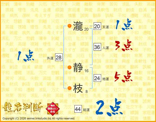 生活面を象徴する運勢です。外部から受ける影響力を表し、結婚運、家庭運や職場、環境への順応性を表します。総運から人運を引いた画数。姓や名が1文字の場合を除く。