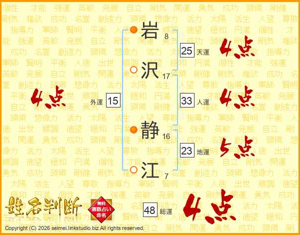 岩(8画)沢(17画) 静(16画)江(7画)