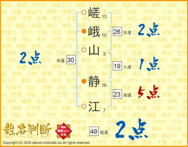 嵯(13画)峨(10画)山(3画) 静(16画)江(7画)
