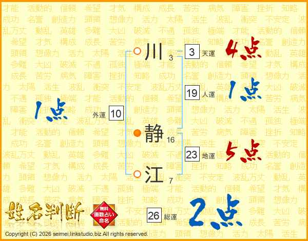 生活面を象徴する運勢です。外部から受ける影響力を表し、結婚運、家庭運や職場、環境への順応性を表します。総運から人運を引いた画数。姓や名が1文字の場合を除く。