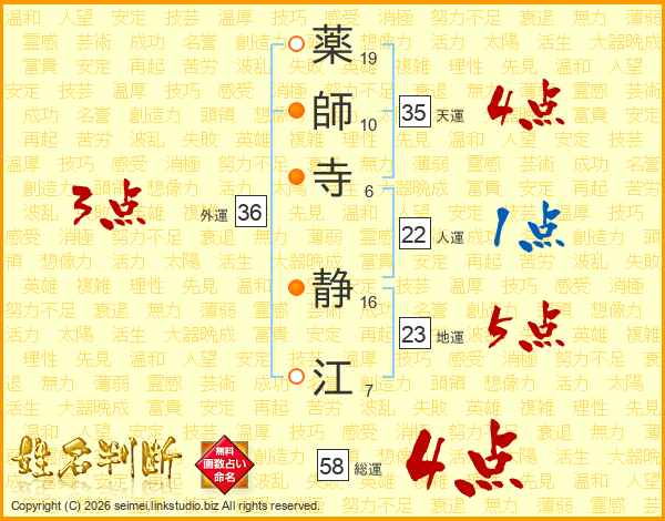 薬(19画)師(10画)寺(6画) 静(16画)江(7画)