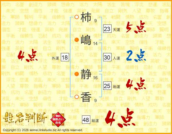 柿(9画)嶋(14画) 静(16画)香(9画)