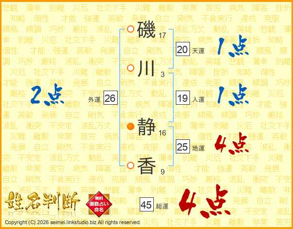 生活面を象徴する運勢です。外部から受ける影響力を表し、結婚運、家庭運や職場、環境への順応性を表します。総運から人運を引いた画数。姓や名が1文字の場合を除く。