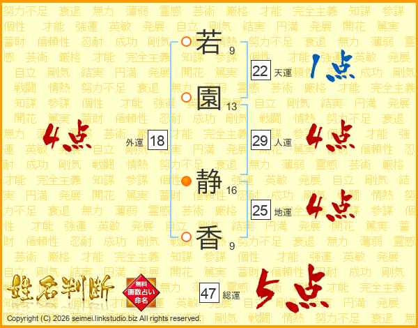 若(9画)園(13画) 静(16画)香(9画)