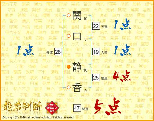 関(19画)口(3画) 静(16画)香(9画)