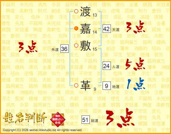 渡嘉敷革さんの総運は51画の3点!