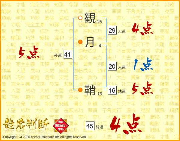 あなたの人生を表す1番重要な運勢です。生涯を通じて影響する総合運となり、主に50歳以降の晩年期に影響を及ぼします。苗字と名前の合計画数。