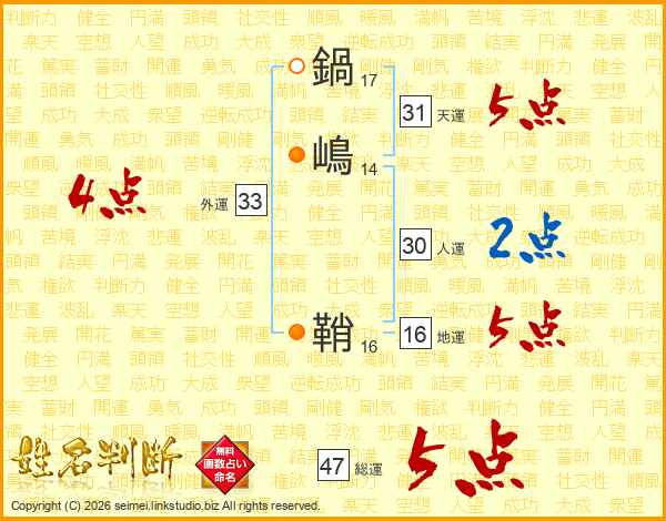 鍋嶋鞘さんの総運は47画の5点!