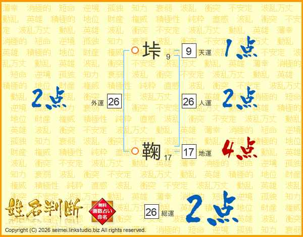 生活面を象徴する運勢です。外部から受ける影響力を表し、結婚運、家庭運や職場、環境への順応性を表します。総運から人運を引いた画数。姓や名が1文字の場合を除く。