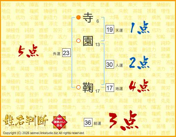 生活面を象徴する運勢です。外部から受ける影響力を表し、結婚運、家庭運や職場、環境への順応性を表します。総運から人運を引いた画数。姓や名が1文字の場合を除く。