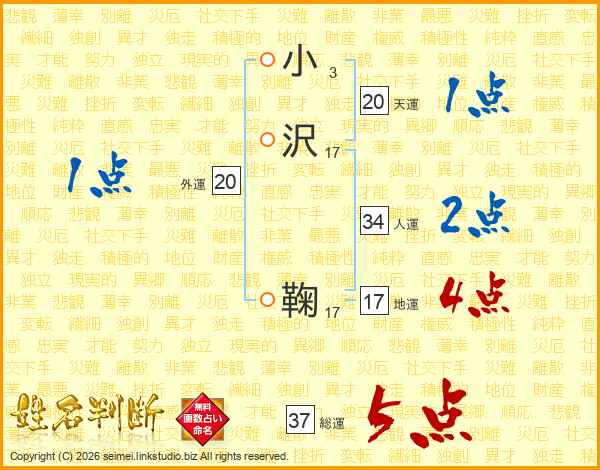 生活面を象徴する運勢です。外部から受ける影響力を表し、結婚運、家庭運や職場、環境への順応性を表します。総運から人運を引いた画数。姓や名が1文字の場合を除く。