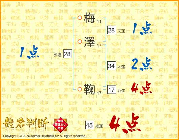 生活面を象徴する運勢です。外部から受ける影響力を表し、結婚運、家庭運や職場、環境への順応性を表します。総運から人運を引いた画数。姓や名が1文字の場合を除く。