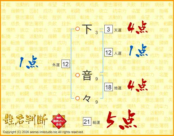 生活面を象徴する運勢です。外部から受ける影響力を表し、結婚運、家庭運や職場、環境への順応性を表します。総運から人運を引いた画数。姓や名が1文字の場合を除く。