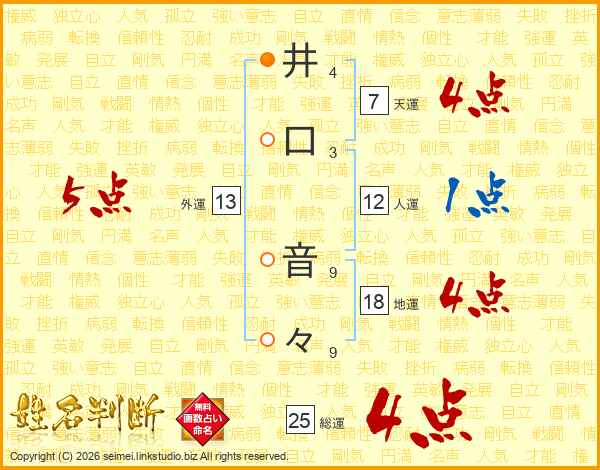 生活面を象徴する運勢です。外部から受ける影響力を表し、結婚運、家庭運や職場、環境への順応性を表します。総運から人運を引いた画数。姓や名が1文字の場合を除く。