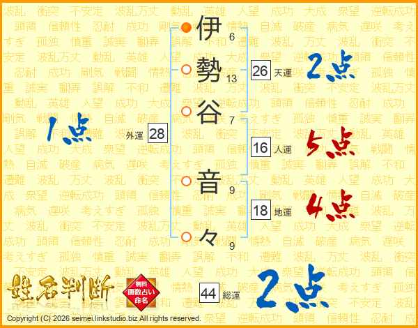 伊(6画)勢(13画)谷(7画) 音(9画)々(9画)