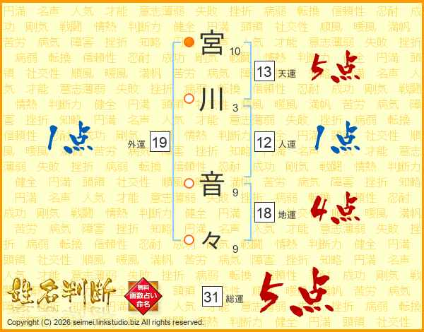 生活面を象徴する運勢です。外部から受ける影響力を表し、結婚運、家庭運や職場、環境への順応性を表します。総運から人運を引いた画数。姓や名が1文字の場合を除く。