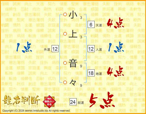 生活面を象徴する運勢です。外部から受ける影響力を表し、結婚運、家庭運や職場、環境への順応性を表します。総運から人運を引いた画数。姓や名が1文字の場合を除く。