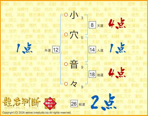生活面を象徴する運勢です。外部から受ける影響力を表し、結婚運、家庭運や職場、環境への順応性を表します。総運から人運を引いた画数。姓や名が1文字の場合を除く。
