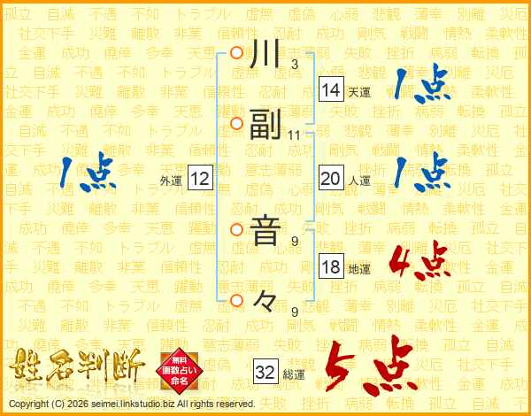 生活面を象徴する運勢です。外部から受ける影響力を表し、結婚運、家庭運や職場、環境への順応性を表します。総運から人運を引いた画数。姓や名が1文字の場合を除く。