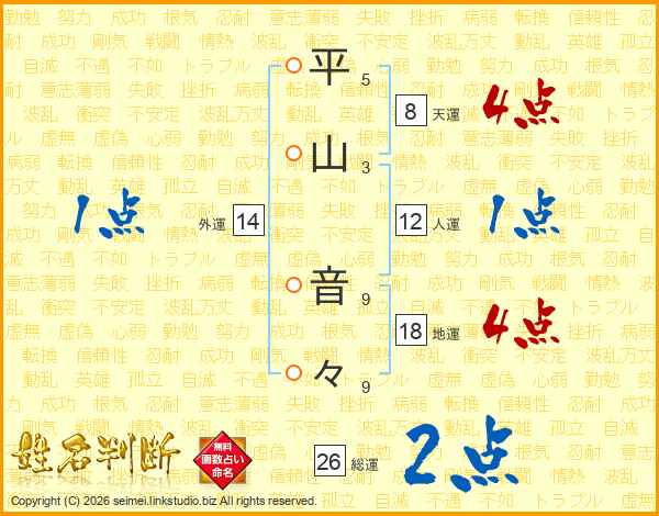 生活面を象徴する運勢です。外部から受ける影響力を表し、結婚運、家庭運や職場、環境への順応性を表します。総運から人運を引いた画数。姓や名が1文字の場合を除く。