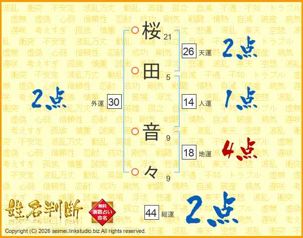 あなたの人生を表す1番重要な運勢です。生涯を通じて影響する総合運となり、主に50歳以降の晩年期に影響を及ぼします。苗字と名前の合計画数。