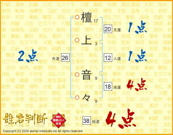 檀上音々さんの総運は38画の4点!