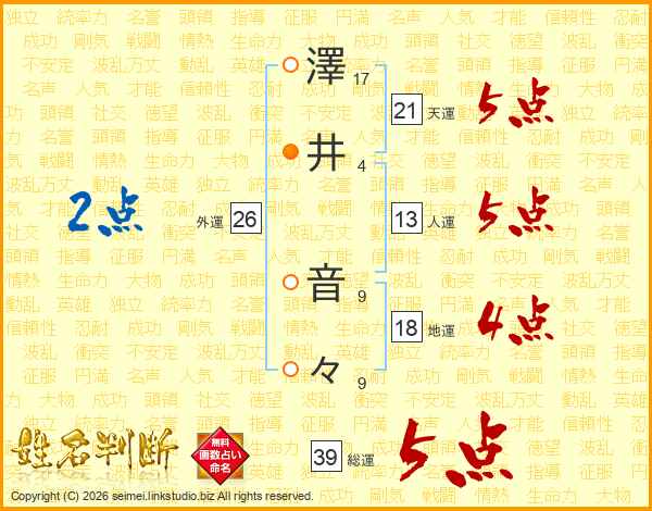 澤井音々さんの総運は39画の5点!