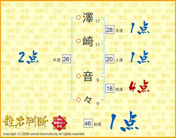 生活面を象徴する運勢です。外部から受ける影響力を表し、結婚運、家庭運や職場、環境への順応性を表します。総運から人運を引いた画数。姓や名が1文字の場合を除く。