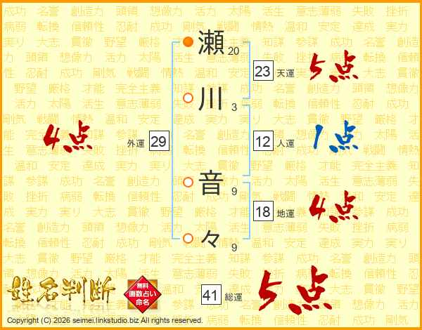 瀬川音々さんの総運は41画の5点!