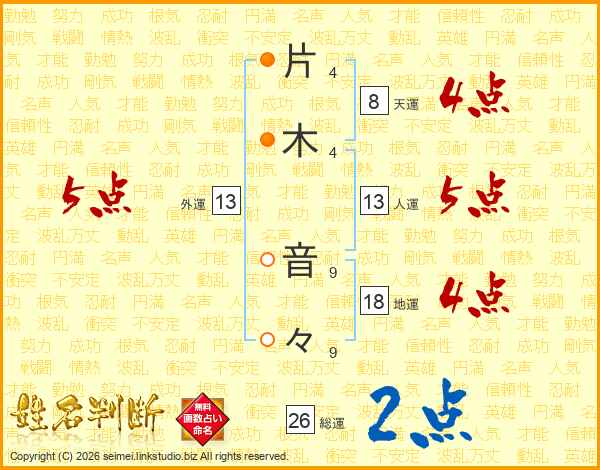 生活面を象徴する運勢です。外部から受ける影響力を表し、結婚運、家庭運や職場、環境への順応性を表します。総運から人運を引いた画数。姓や名が1文字の場合を除く。